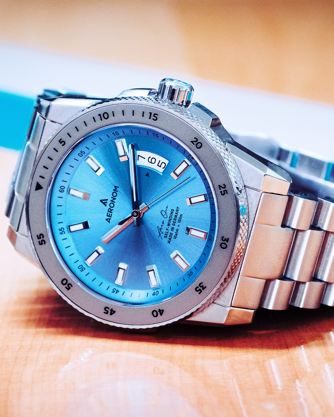 The ‘Aero One’ is made with the best suppliers available. It features a solid stainless steel case with brushed and polished surfaces, overtopped by a bold 41,5mm bezel, finely knurled with a diamond pattern. Wear it proud!